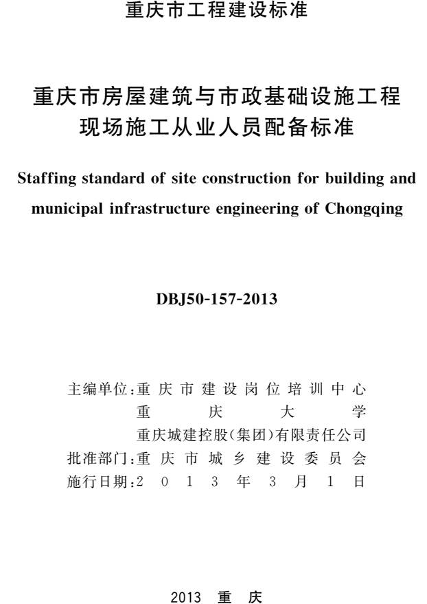 《重慶市房屋建筑與市政基礎(chǔ)設(shè)施工程現(xiàn)場施工從業(yè)人員配備標(biāo)準(zhǔn)》(DBJ50-157-2013)【全文為PDF版下載】