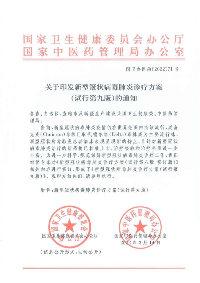 國衛(wèi)辦醫(yī)函〔2022〕71號《國家衛(wèi)生健康委員會辦公廳國家中醫(yī)藥管理局辦公室關(guān)于印發(fā)新型冠狀病毒肺炎診療方案(試行第九版)的通知》
