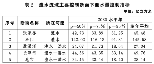 多年平均及不同來水頻率下澧水流域主要斷面下泄水量控制指標(biāo)見表2。