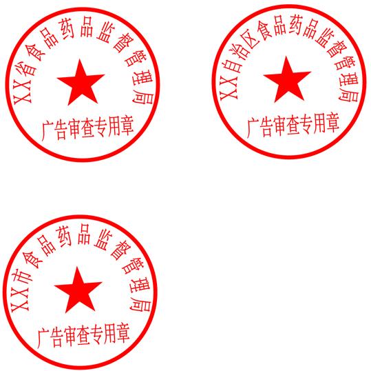 新的廣告審查專用章直徑為4.2厘米,中央刊五角星,五角星外刊機(jī)關(guān)名稱,前段自左而右環(huán)行為?。▍^(qū)、市)食品藥品監(jiān)管部門名稱,后段自左而右橫排為廣告審查專用章字樣(式樣見附件)。