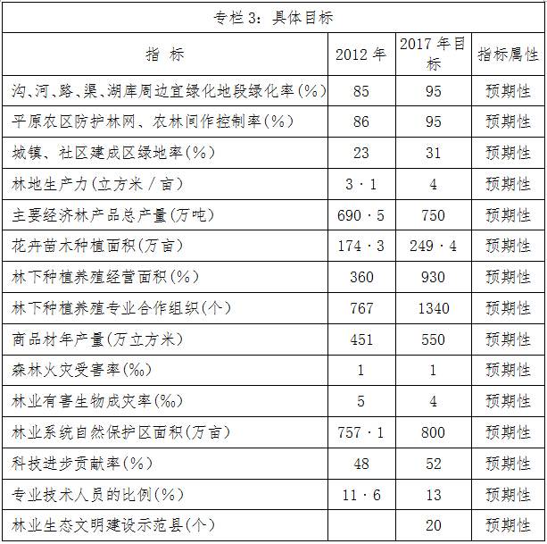 到2020年,全省森林面積達(dá)到6300萬畝,森林覆蓋率達(dá)到25%以上,森林蓄積量達(dá)到19500萬立方米以上,林業(yè)產(chǎn)業(yè)年總產(chǎn)值達(dá)到2300億元以上,形成銷售收入10億元以上的林業(yè)產(chǎn)業(yè)化集群75個,森林植被總碳儲量力爭達(dá)到11400萬噸以上,年林業(yè)生態(tài)效益價值達(dá)到6600億元以上,農(nóng)民來自林業(yè)的純收入平均達(dá)到1200元。