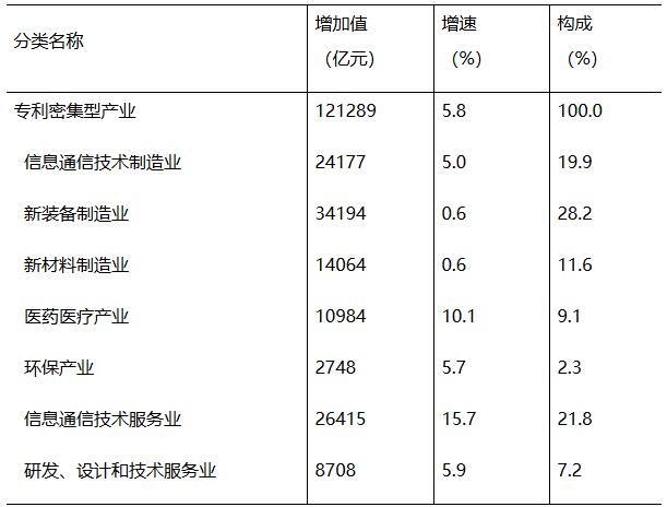 專利密集型產(chǎn)業(yè)增加值,指我國(guó)專利密集型產(chǎn)業(yè)所有常住單位一定時(shí)期內(nèi)生產(chǎn)活動(dòng)所創(chuàng)造的增加值。
