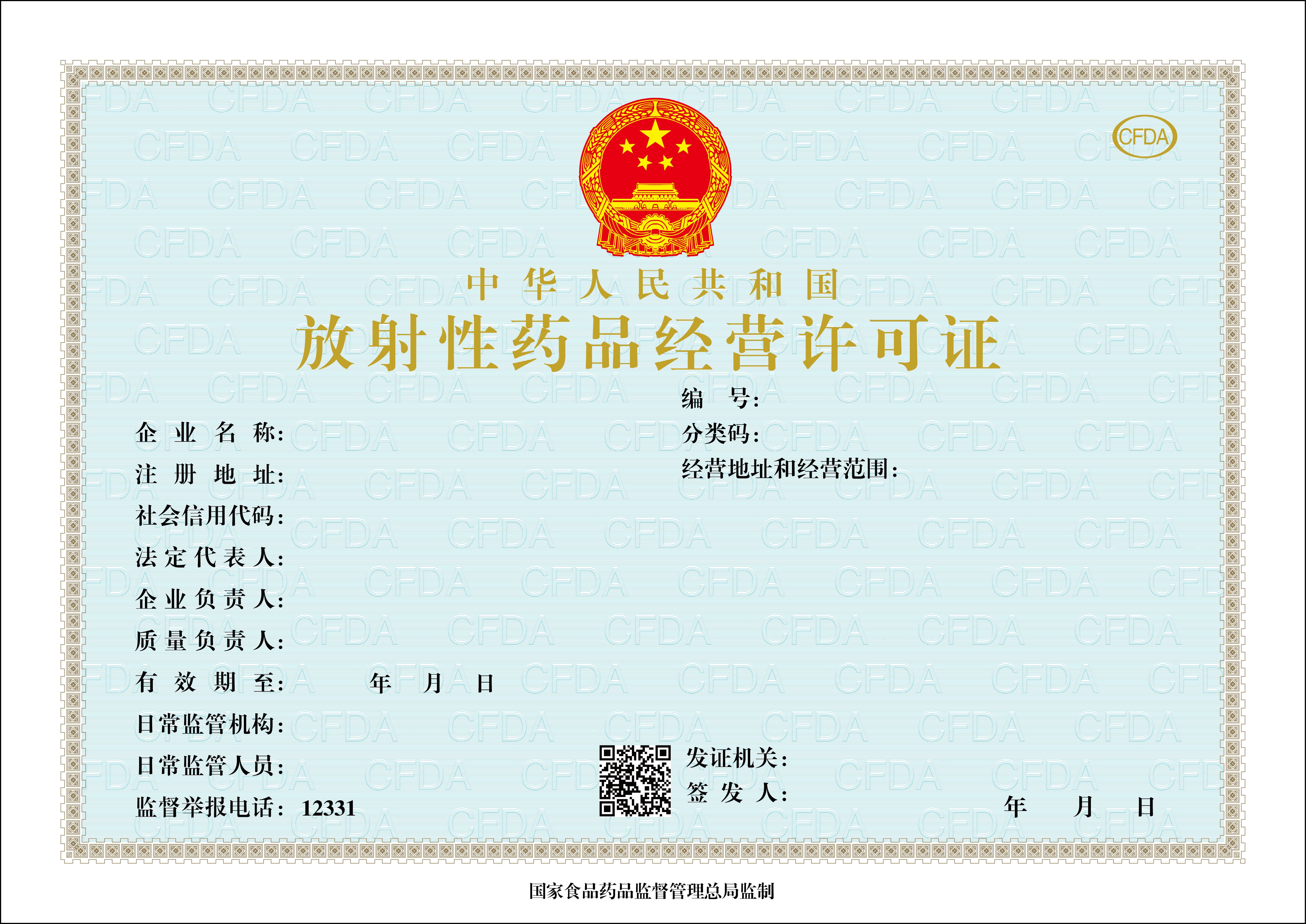 (五)食品藥品監(jiān)管總局統(tǒng)一印制新版《放射性藥品生產(chǎn)許可證》和《放射性藥品經(jīng)營許可證》(式樣見附件2、3)。省局可根據(jù)本行政區(qū)域內(nèi)放射性藥品生產(chǎn)、經(jīng)營企業(yè)的數(shù)量和實際發(fā)證需要向食品藥品監(jiān)管總局書面申請領(lǐng)取。