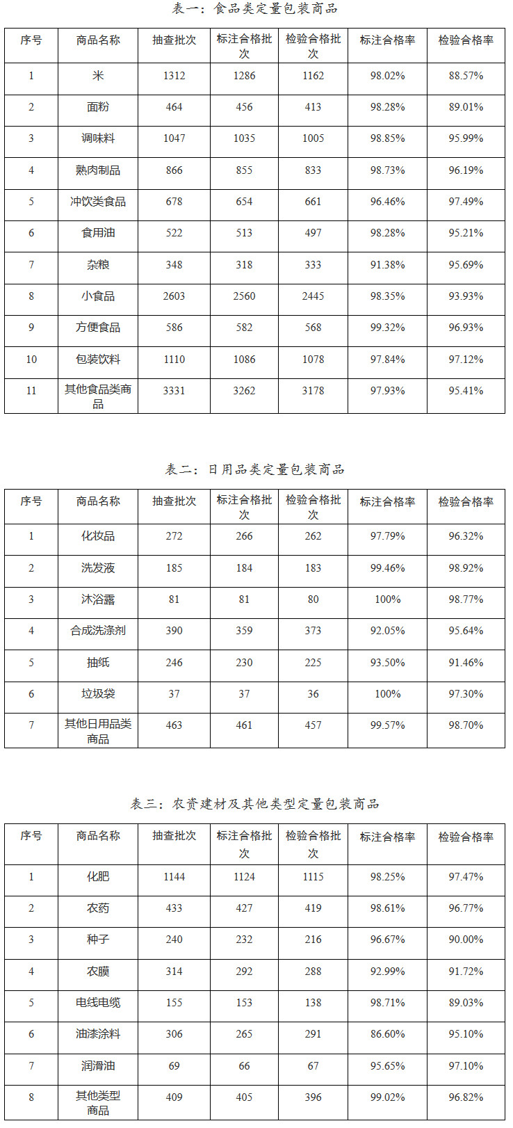 此次定量包裝商品凈含量計(jì)量監(jiān)督專項(xiàng)檢查在全國(guó)31個(gè)省、自治區(qū)、直轄市和新疆生產(chǎn)建設(shè)兵團(tuán)部署開(kāi)展,共抽查企業(yè)6037家,抽查食品類(lèi)、日用品類(lèi)、農(nóng)資建材類(lèi)以及其他種類(lèi)定量包裝商品共計(jì)17611批次,其中,凈含量標(biāo)注合格17189批次,凈含量標(biāo)注抽樣合格率為97.60%;凈含量檢驗(yàn)合格16719批次,凈含量檢驗(yàn)抽樣合格率為94.93%。