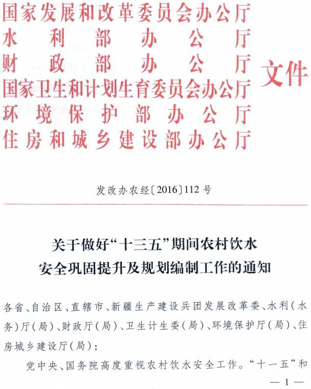 發(fā)改辦農(nóng)經(jīng)〔2016〕112號《關(guān)于做好“十三五”期間農(nóng)村飲水安全鞏固提升及規(guī)劃編制工作的通知》