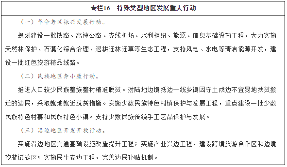 大力推進革命老區(qū)、民族地區(qū)、邊疆地區(qū)脫貧攻堅。加大脫貧攻堅力度,支持革命老區(qū)開發(fā)建設(shè),推進實施贛閩粵原中央蘇區(qū)、左右江、大別山、陜甘寧、川陜等重點貧困革命老區(qū)振興發(fā)展規(guī)劃,積極支持沂蒙、湘鄂贛、太行、海陸豐等欠發(fā)達革命老區(qū)加快發(fā)展。擴大對革命老區(qū)的財政轉(zhuǎn)移支付規(guī)模。加快推進民族地區(qū)重大基礎(chǔ)設(shè)施項目和民生工程建設(shè),實施少數(shù)民族特困地區(qū)和特困群體綜合扶貧工程,出臺人口較少民族整體脫貧的特殊政策措施。編制邊境扶貧專項規(guī)劃,采取差異化政策,加快推進邊境地區(qū)基礎(chǔ)設(shè)施和社會保障設(shè)施建設(shè),集中改善邊民生產(chǎn)生活條件,扶持發(fā)展邊境貿(mào)易和特色經(jīng)濟,大力推進興邊富民行動,使邊民能夠安心生產(chǎn)生活、安心守邊固邊。加大對邊境地區(qū)的財政轉(zhuǎn)移支付力度,完善邊民補貼機制。加大中央投入力度,采取特殊扶持政策,推進西藏、四省藏區(qū)和新疆南疆四地州脫貧攻堅。