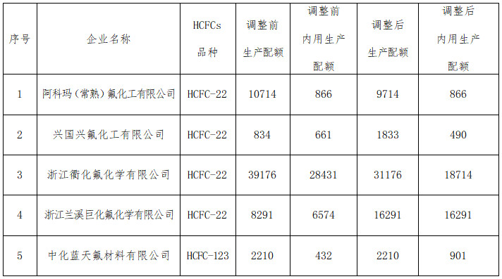 阿科瑪(常熟)氟化工有限公司等5家企業(yè)2023年度含氫氯氟烴(HCFCs)生產(chǎn)配額調(diào)整情況表