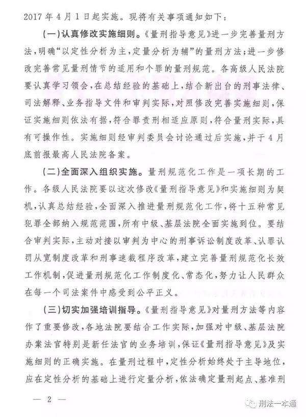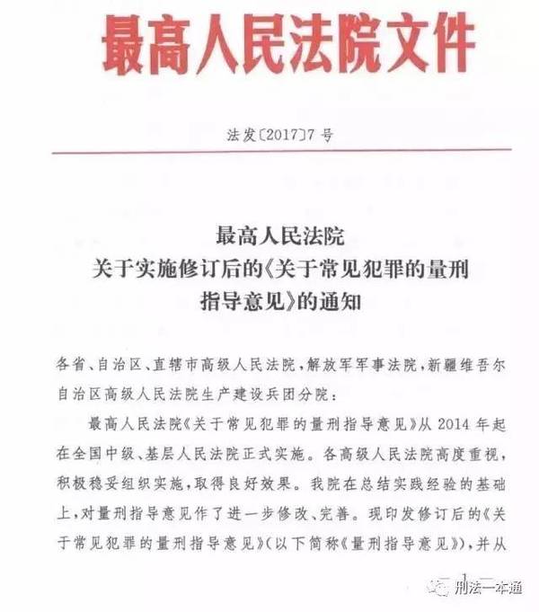 法發(fā)〔2017〕7號《最高人民法院關(guān)于實施修訂后的〈關(guān)于常見犯罪量刑指導意見〉的通知》