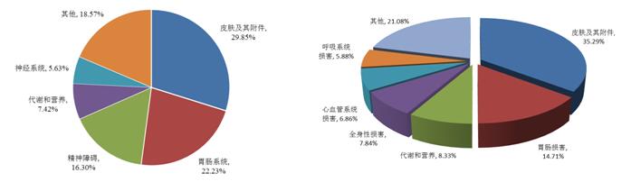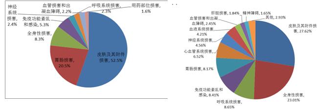 2016年國家基本藥物目錄中成藥部分藥品不良反應/事件報告中,累及系統(tǒng)排名前三位的是皮膚及其附件損害(占29.0%)、胃腸系統(tǒng)損害(占23.4%)和全身性損害(占14.3%)。不同劑型報告累及系統(tǒng)中,注射劑不良反應/事件累及系統(tǒng)排名前三位的是皮膚及其附件損害(占21.4%)、全身性損害(占12.7%)、胃腸系統(tǒng)損害(占6.5%),口服制劑累及系統(tǒng)排名前三位的是胃腸系統(tǒng)損害(占16.1%)、皮膚及其附件損害(占5.1%)、神經系統(tǒng)損害(占2.6%)。