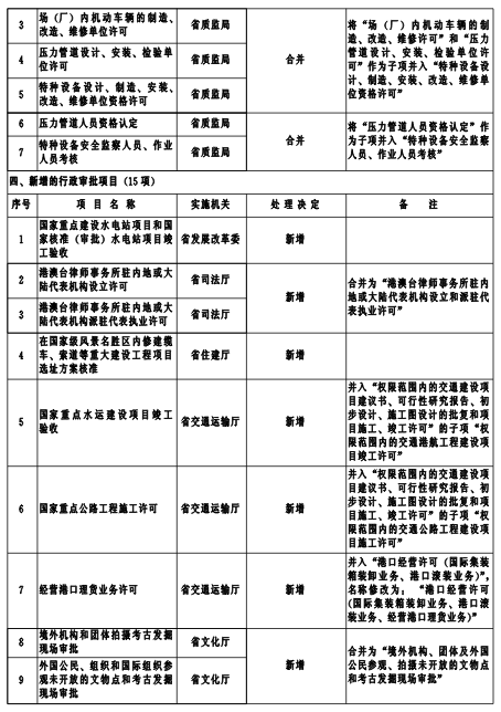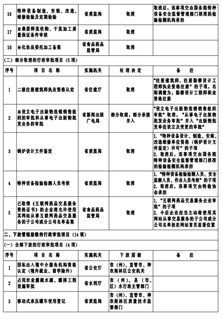 為深入貫徹落實黨的十八大和十八屆三中、四中全會關(guān)于簡政放權(quán)、深化行政審批制度改革的要求,經(jīng)審核論證,省人民政府決定再取消、調(diào)整行政審批項目59項(包括非行政許可審批項目12項)。其中,全部取消18項、部分取消5項、全部下放4項、部分下放10項、合并7項、新增15項。