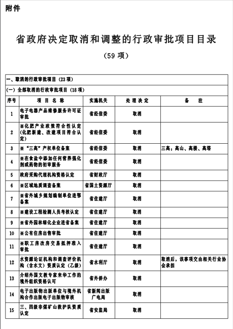附件:省政府決定取消和調(diào)整的行政審批項目目錄(59項)