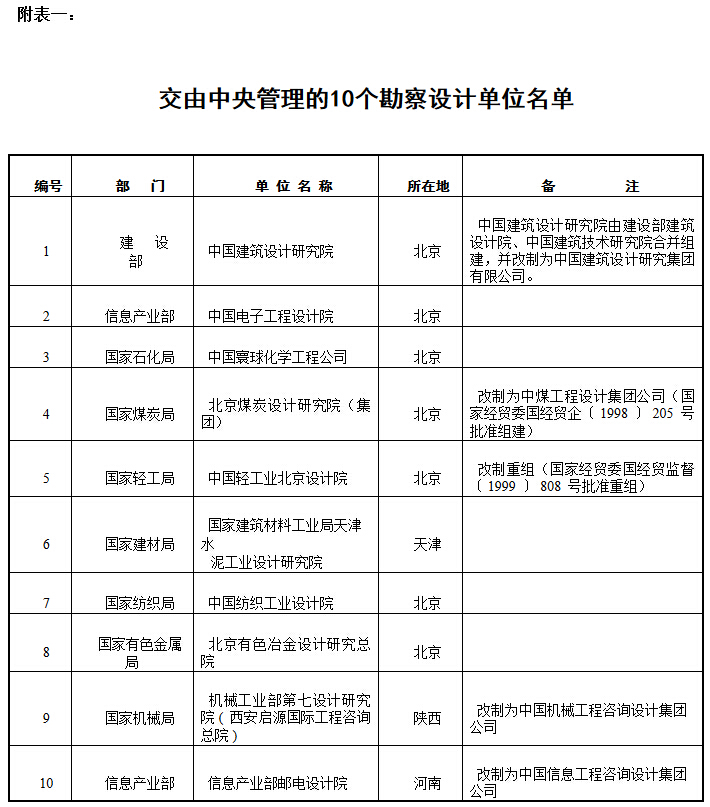 1.中國(guó)建筑設(shè)計(jì)研究院等10個(gè)勘察設(shè)計(jì)單位交由中央管理(名單詳見(jiàn)附表一)。