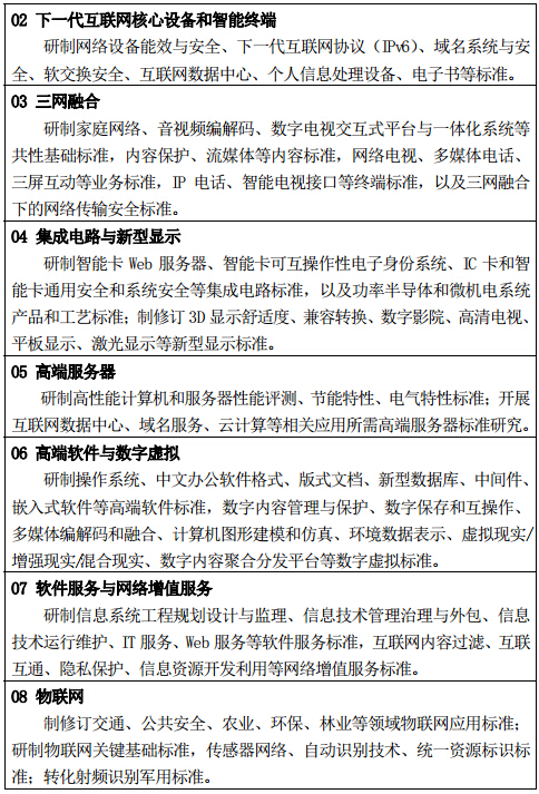 加強(qiáng)信息網(wǎng)絡(luò)基礎(chǔ)設(shè)施、新一代移動(dòng)通信、下一代互聯(lián)網(wǎng)核心設(shè)備和智能終端、三網(wǎng)融合、物聯(lián)網(wǎng)、云計(jì)算、集成電路、新型顯示、高端軟件、高端服務(wù)器、軟件服務(wù)與網(wǎng)絡(luò)增值服務(wù)、數(shù)字虛擬等領(lǐng)域的標(biāo)準(zhǔn)化工作,開展10個(gè)高新技術(shù)標(biāo)準(zhǔn)化試點(diǎn)示范建設(shè),形成傳感器網(wǎng)絡(luò)、射頻識(shí)別、云計(jì)算、新型顯示、信息安全、軟件服務(wù)等具有自主技術(shù)的10大重要標(biāo)準(zhǔn)體系,支撐物聯(lián)網(wǎng)產(chǎn)業(yè)試點(diǎn)示范、三網(wǎng)融合試點(diǎn)等重點(diǎn)工程的實(shí)施,促進(jìn)新一代信息技術(shù)產(chǎn)業(yè)的發(fā)展。