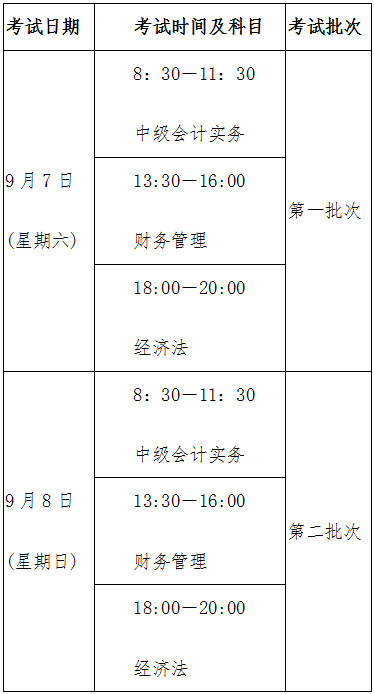 中級資格考試于2019年9月7日—8日舉行,共兩個批次;9月9日,為中級資格考試備用時間。