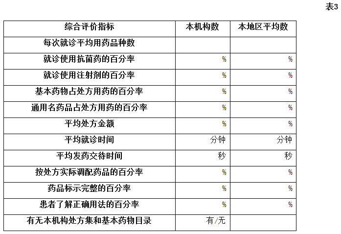 5.表3中“本地區(qū)平均數(shù)”是指本地市或者本省醫(yī)療機(jī)構(gòu)各項(xiàng)指標(biāo)的平均值,計(jì)算方法為:隨機(jī)抽取本地區(qū)10—20家醫(yī)院,處方總量不少于600例(張)的平均值,即抽取10家醫(yī)院時(shí),每家醫(yī)院隨機(jī)抽取不少于60例(張)處方,抽取20家醫(yī)院時(shí),每家醫(yī)院隨機(jī)抽取不少于30例(張)處方。“意見(jiàn)”欄由醫(yī)療機(jī)構(gòu)藥事管理委員會(huì)或者衛(wèi)生行政部門(mén)組織的藥學(xué)專家,根據(jù)各項(xiàng)評(píng)價(jià)指標(biāo)對(duì)醫(yī)療機(jī)構(gòu)藥事管理或者醫(yī)師處方情況提出意見(jiàn)、建議,某項(xiàng)指標(biāo)嚴(yán)重超常時(shí),應(yīng)當(dāng)提出預(yù)警信息。