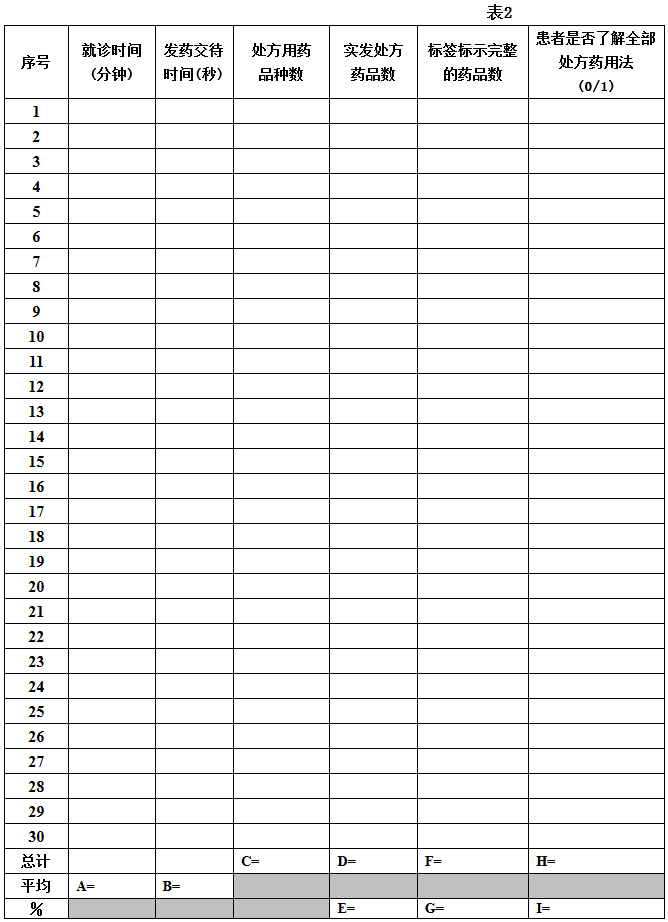 4.填寫(xiě)表2時(shí),可以從門(mén)診取藥患者中隨機(jī)選取30位,由調(diào)查人員現(xiàn)場(chǎng)填寫(xiě)。