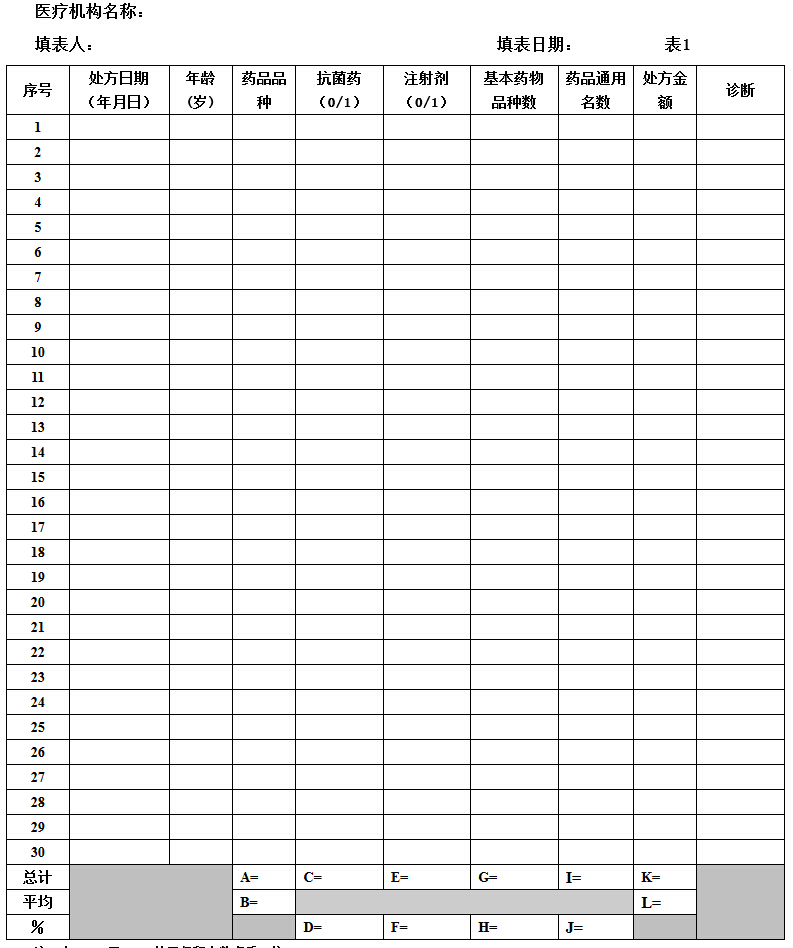 3.表1中“藥品品種”、“抗菌藥(0/1)”、“注射劑(0/1)”、“基本藥物品種數(shù)”“藥品通用名數(shù)”、“處方金額”均為每張?zhí)幏降臄?shù)據(jù),其中,“基本藥物品種數(shù)”為國(guó)家或者本省基本藥物目錄中的藥物品種。