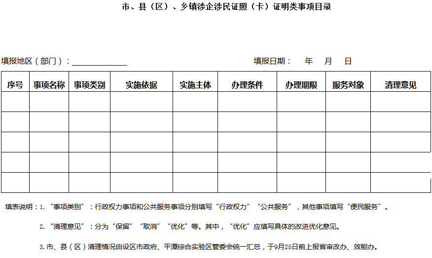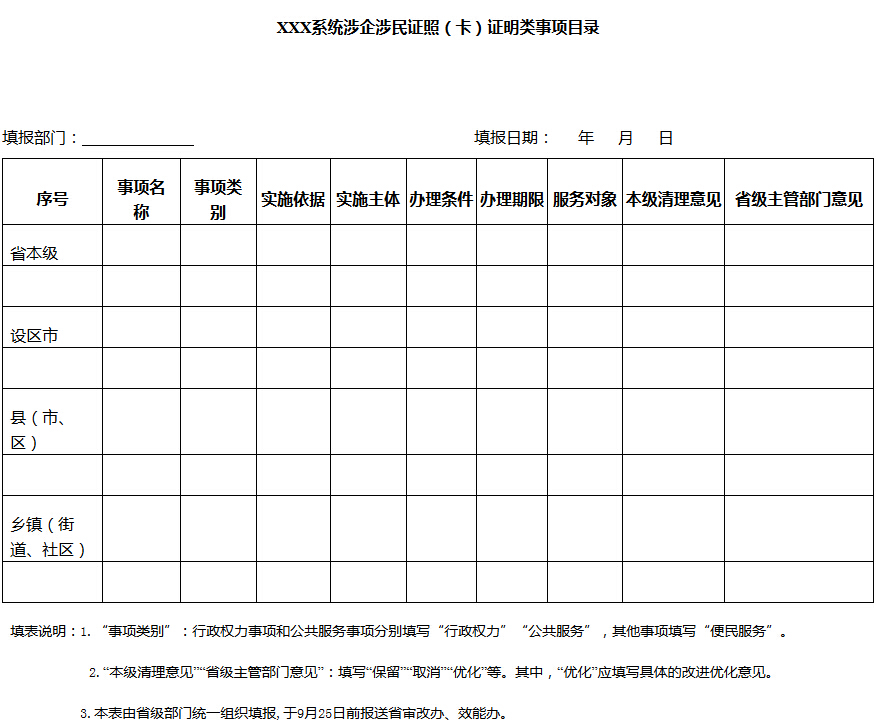 全面清理、精簡(jiǎn)省、市、縣三級(jí)行政權(quán)力清單、公共服務(wù)事項(xiàng)清單和其他相關(guān)職責(zé)及鄉(xiāng)鎮(zhèn)(街道)、社區(qū)職責(zé)范圍內(nèi),涉及企業(yè)、公民辦事的各種證照(卡)及有關(guān)證明,主要包括行政機(jī)關(guān)、事業(yè)單位向企業(yè)、公民核發(fā)的各類證照(卡)、執(zhí)照和企業(yè)、公民辦事要求相關(guān)行政機(jī)關(guān)、事業(yè)單位及鄉(xiāng)鎮(zhèn)(街道)、社區(qū)等出具的證明類材料。對(duì)沒(méi)有法律法規(guī)規(guī)章或省委、省政府規(guī)范性文件依據(jù)的,應(yīng)予以取消;進(jìn)一步精簡(jiǎn)辦理?xiàng)l件,梳理前置條件尤其是互為前置的條件,能取消的一律取消;落實(shí)“五個(gè)規(guī)范、四個(gè)統(tǒng)一”,統(tǒng)一規(guī)范辦事指南,優(yōu)化辦理流程,精簡(jiǎn)辦理環(huán)節(jié)和辦理時(shí)限,提高辦事效率,改善辦事作風(fēng),提升群眾滿意率,切實(shí)解決群眾“辦事難、辦證難”問(wèn)題。