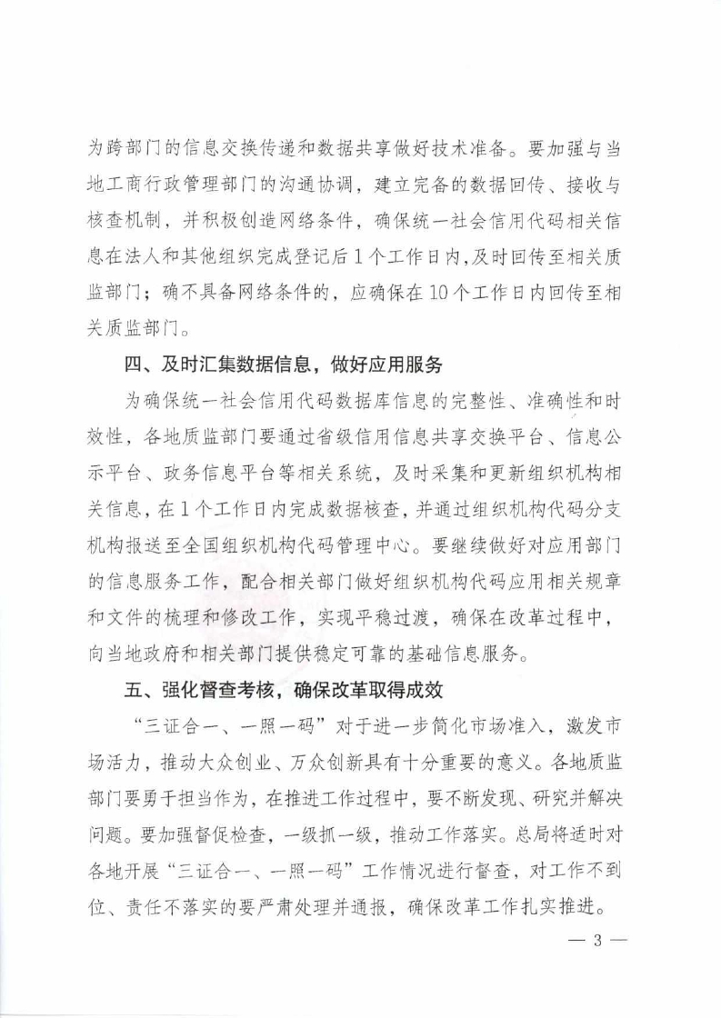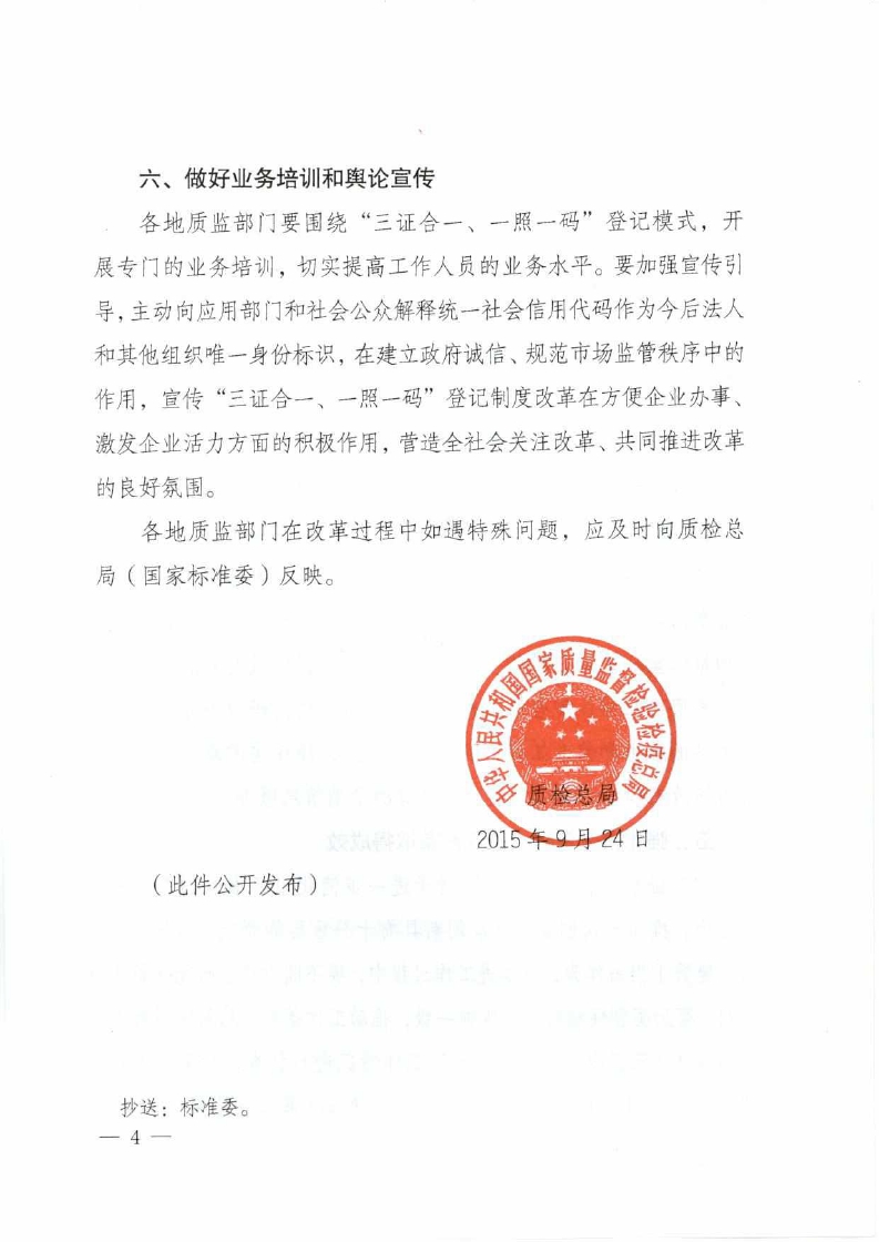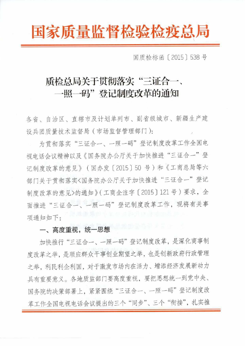 國質(zhì)檢標(biāo)函〔2015〕538號《質(zhì)檢總局關(guān)于貫徹落實(shí)“三證合一、一照一碼”登記制度改革的通知》