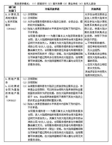 對于本協(xié)議第二條第一款所指的服務提供模式的市場開放,一方對另一方的服務和符合本協(xié)議附件二及本協(xié)議其他所列條件的服務提供者給予的待遇,不得低于該方在本協(xié)議附件一及《海峽兩岸經(jīng)濟合作框架協(xié)議》附件四中列明的內(nèi)容和條件。對以本協(xié)議第二條第一款第一項、第三項所指模式提供的服務,如一方就其作出市場開放承諾,則該方應允許相關的資本移動。