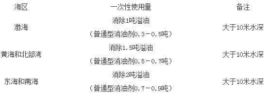 第八條 各海區(qū)每個(gè)溢油點(diǎn)(兩溢油點(diǎn)間距小于1000米者為一個(gè)溢油點(diǎn))的消油劑一次性使用量不得超過規(guī)定數(shù)量: