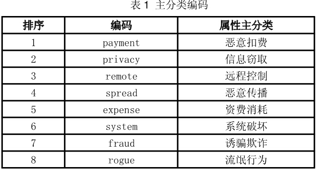 移動互聯(lián)網(wǎng)惡意程序屬性主分類編碼及排序如表1所示: