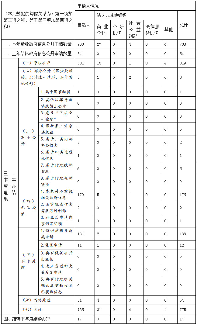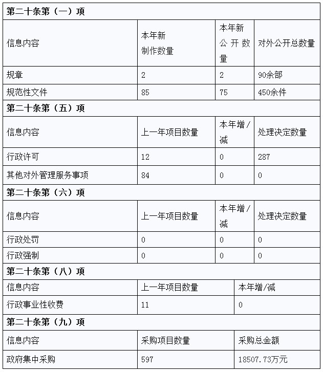根據(jù)《中華人民共和國(guó)政府信息公開條例》(國(guó)務(wù)院令第711號(hào))有關(guān)規(guī)定,編制本年度報(bào)告。本報(bào)告由總體情況、主動(dòng)公開政府信息情況、收到和處理政府信息公開申請(qǐng)情況、因政府信息公開工作被申請(qǐng)行政復(fù)議和提起行政訴訟情況、工作中存在的主要問(wèn)題和改進(jìn)情況、其他需要報(bào)告的事項(xiàng)等內(nèi)容組成。本報(bào)告中所列數(shù)據(jù)的統(tǒng)計(jì)期限自2020年1月1日起至12月31日止。