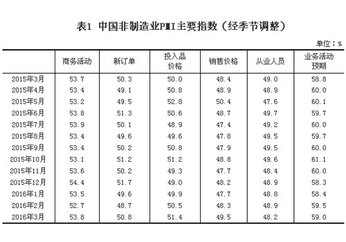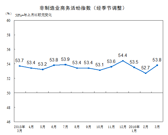 2016年3月份,中國非制造業(yè)商務(wù)活動(dòng)指數(shù)為53.8%,比上月上升1.1個(gè)百分點(diǎn),非制造業(yè)擴(kuò)張步伐有所加快。