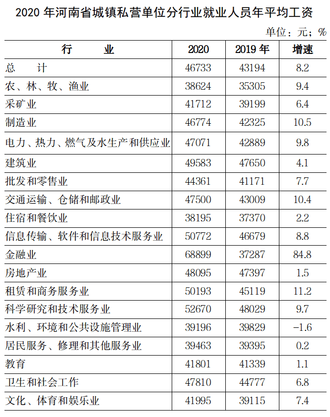 2020年河南省城鎮(zhèn)私營(yíng)單位就業(yè)人員年平均工資46733元