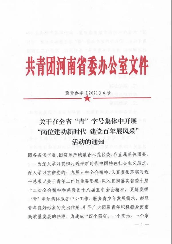 共青團河南省委辦公室關于在全省“青”字號集體中開展“崗位建功新時代建黨百年展風采”活動的通知 豫青辦字〔2021〕6號