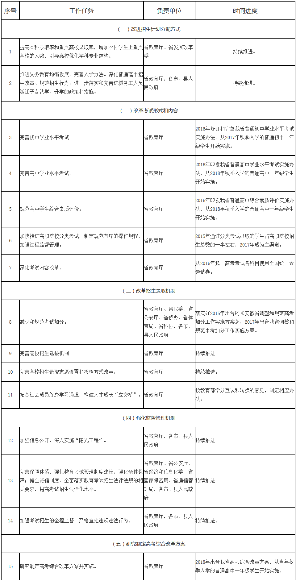 2015年啟動考試招生制度綜合改革,2018年全面推進(jìn),到2021年,基本建立具有中國特色、符合安徽省情的現(xiàn)代教育考試招生制度,形成分類考試、綜合評價、多元錄取的考試招生模式,健全促進(jìn)公平、科學(xué)選才、監(jiān)督有力的體制機制,構(gòu)建銜接溝通各級各類教育、認(rèn)可多種學(xué)習(xí)成果的終身學(xué)習(xí)“立交橋”。
