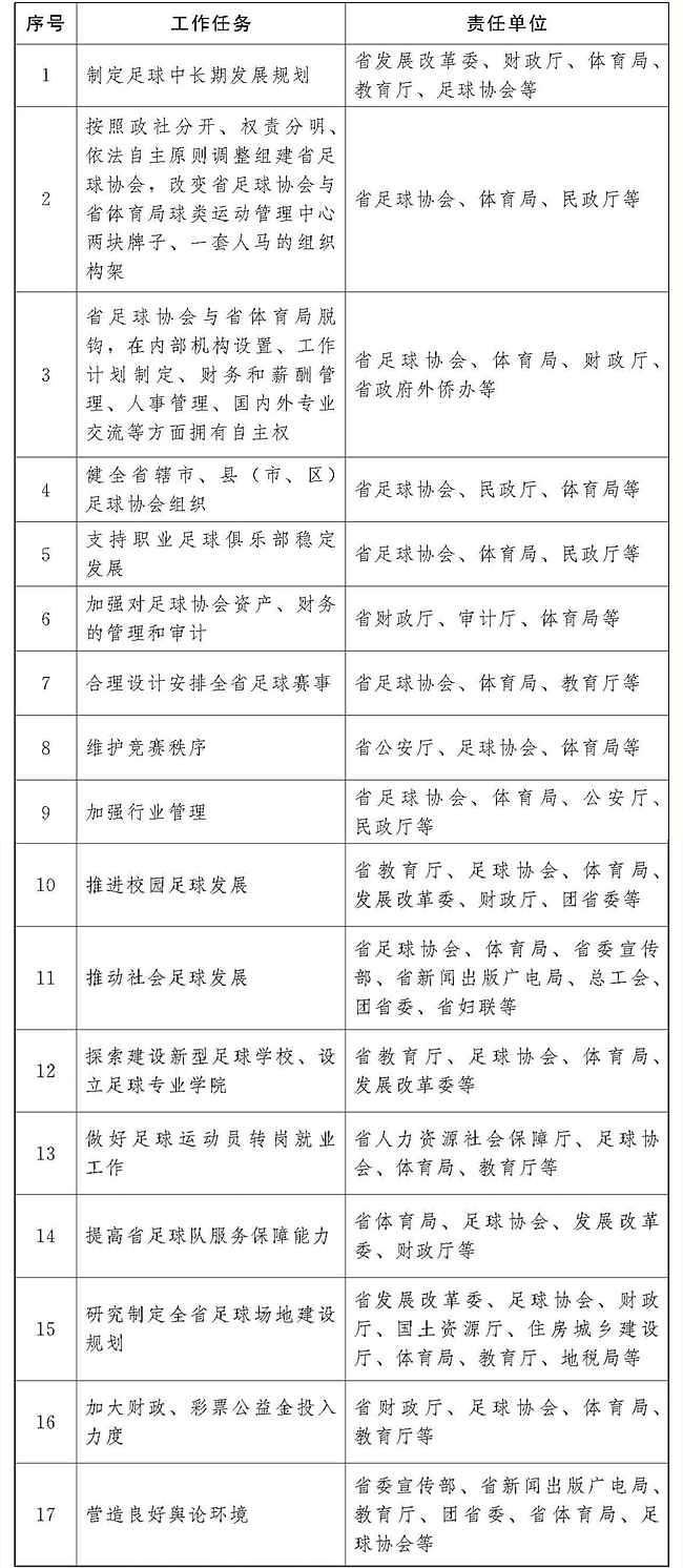 (三十三)建立足球改革發(fā)展聯(lián)席會議制度。為持續(xù)推動足球改革發(fā)展,建立省足球改革發(fā)展聯(lián)席會議制度。聯(lián)席會議由省政府分管負(fù)責(zé)同志擔(dān)任召集人,由省體育局、教育廳、省委宣傳部、省發(fā)展改革委、公安廳、民政廳、財(cái)政廳、人力資源社會保障廳、國土資源廳、住房城鄉(xiāng)建設(shè)廳、國稅局、工商局、新聞出版廣電局、團(tuán)省委等單位組成,聯(lián)席會議下設(shè)辦公室,由省體育局分管足球工作的負(fù)責(zé)同志任辦公室主任,日常工作由省足球協(xié)會承擔(dān)。省體育局要加強(qiáng)對足球改革發(fā)展的政策研究和宏觀指導(dǎo)。省教育廳要履行校園足球改革發(fā)展的主管責(zé)任。各方面要各司其職、各負(fù)其責(zé)、各盡其力、協(xié)同配合,共同推動足球改革發(fā)展。