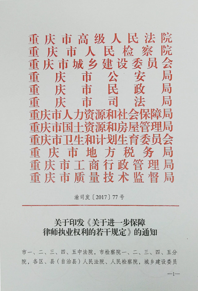 渝司發(fā)〔2017〕77號(hào)《重慶市高級(jí)人民法院等12部門關(guān)于進(jìn)一步保障律師執(zhí)業(yè)權(quán)利的若干規(guī)定》