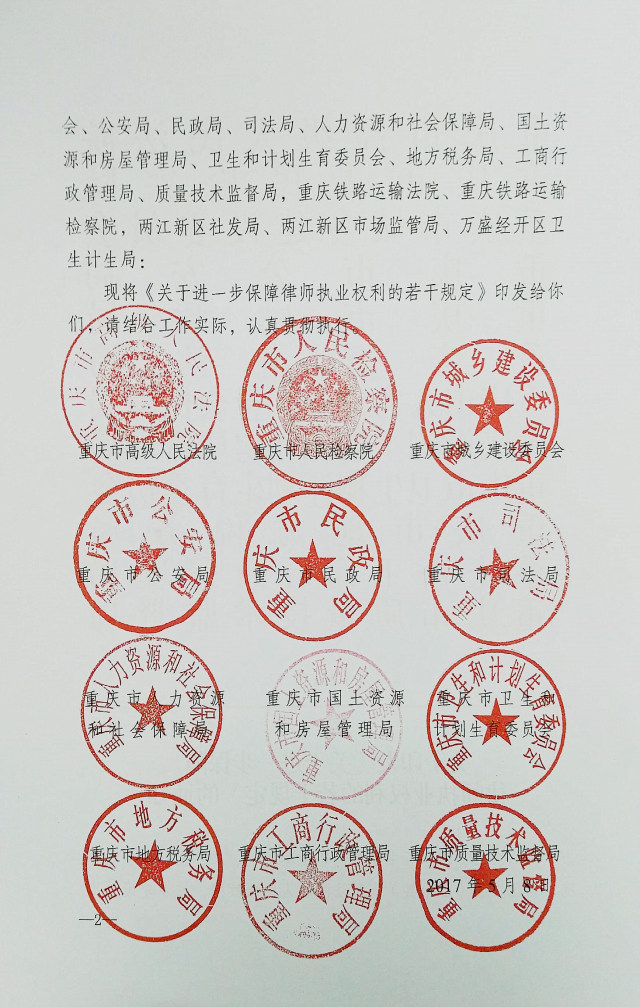 重慶市高級(jí)人民法院等12部門關(guān)于進(jìn)一步保障律師執(zhí)業(yè)權(quán)利的若干規(guī)定