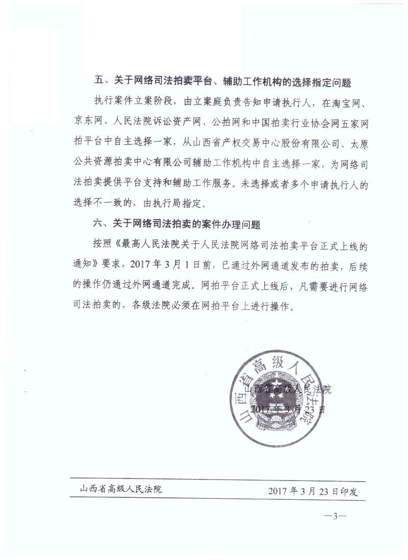 晉高法〔2017〕16號(hào)《山西省高級(jí)人民法院關(guān)于全省法院網(wǎng)絡(luò)司法拍賣有關(guān)問(wèn)題的通知》