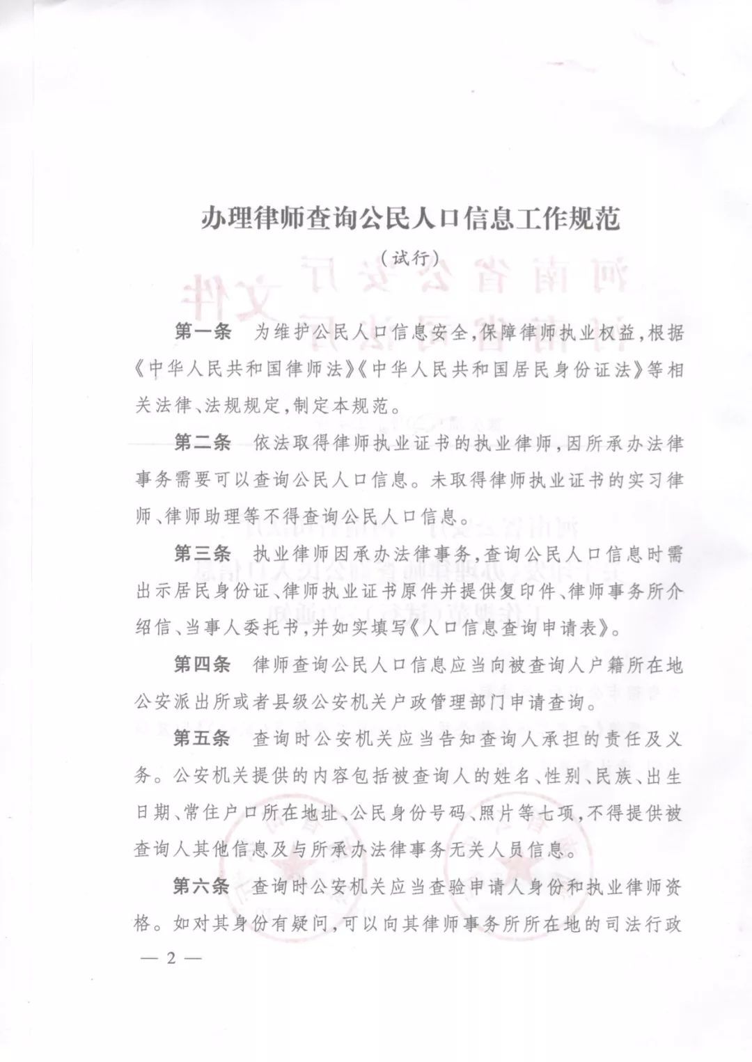 《河南省公安廳河南省司法廳關(guān)于印發(fā)〈辦理律師查詢公民人口信息工作規(guī)范(試行)〉的通知》