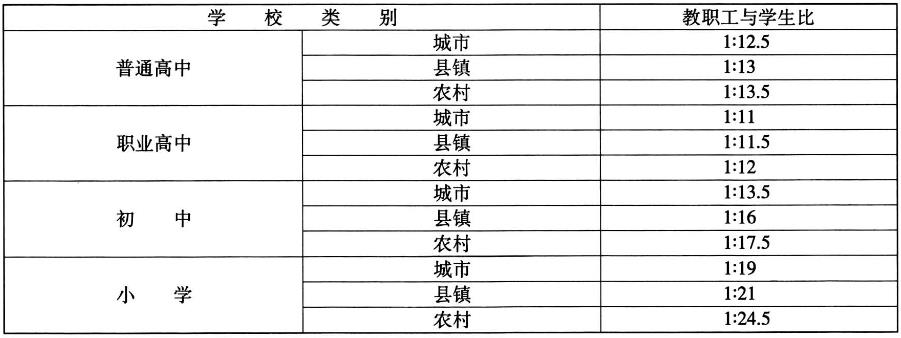 (三)合理確定教職工結(jié)構(gòu)比例。中小學在核定的人員編制范圍內(nèi),按照職位分類、專兼結(jié)合、一人多崗的原則,合理配備教職工,并嚴格按照教師資格的規(guī)定和條件聘任專任教師。職員、教學輔助人員和工勤人員占教職工的比例,普通高中一般不超過16%、職業(yè)高中一般不超過18%、初中一般不超過15%、小學一般不超過9%。有條件的學校后勤服務(wù)工作應(yīng)逐步實行社會化。