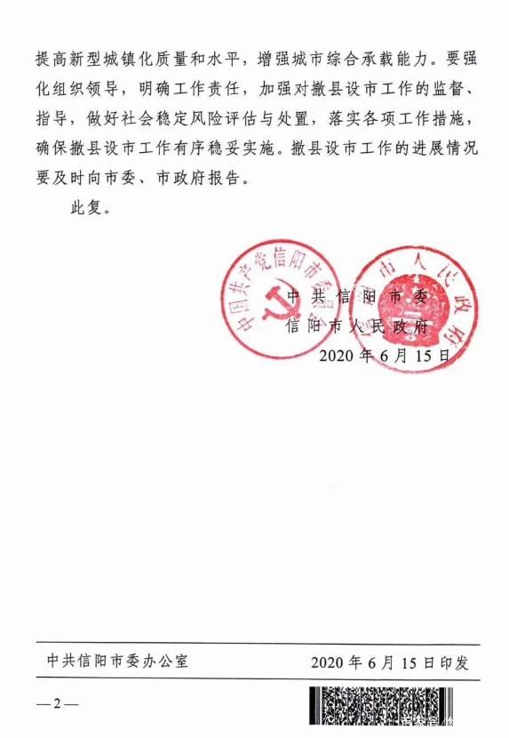 信文〔2020〕41號(hào)《中共信陽(yáng)市委信陽(yáng)市人民政府關(guān)于同意申報(bào)潢川縣撤縣設(shè)市的批復(fù)》
