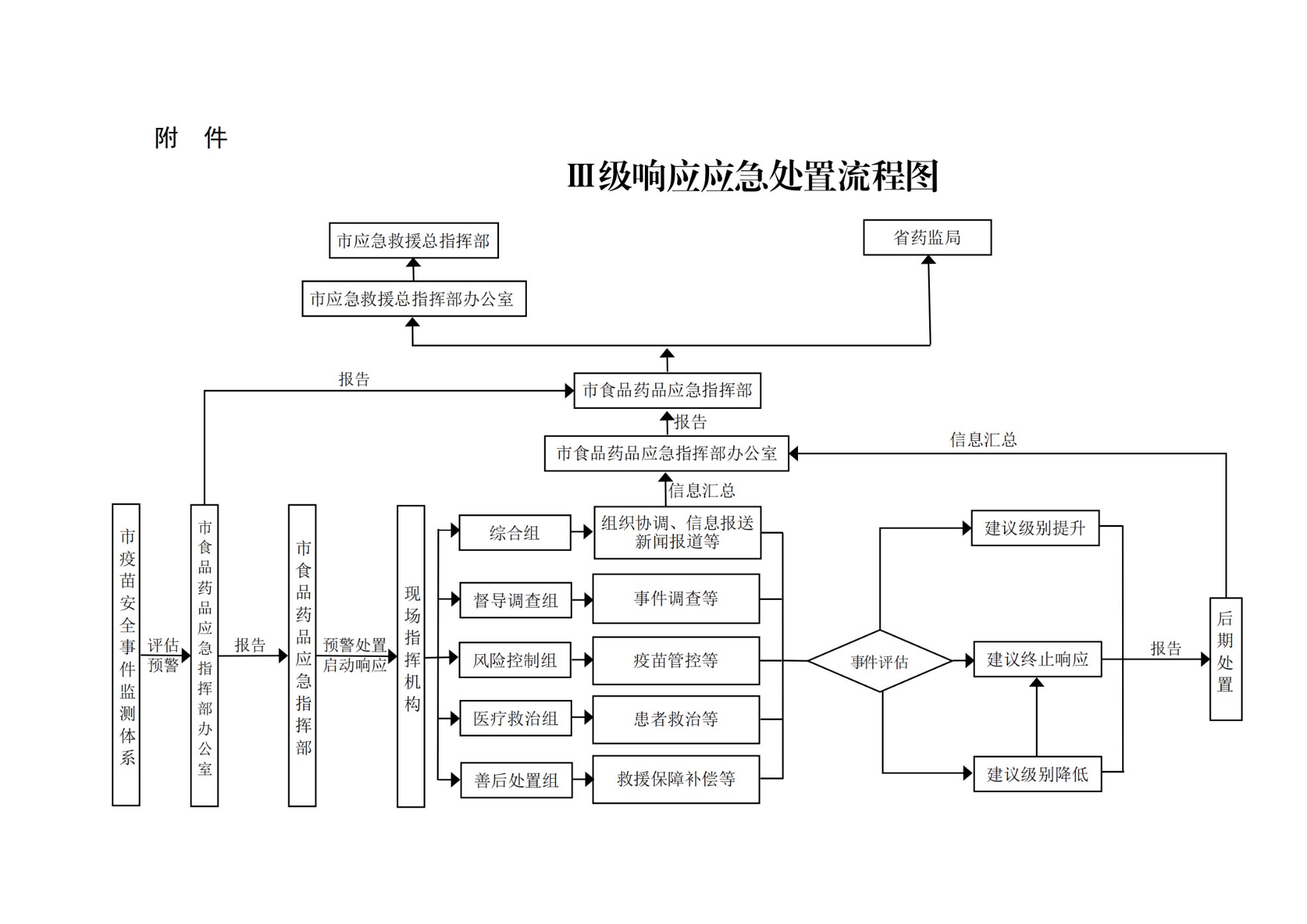 預判為發(fā)生較大疫苗安全事件,由市食品藥品應急指揮部啟動Ⅲ級響應,同時報告市應急救援總指揮部辦公室,按程序開展應急處置工作。市食品藥品應急指揮部統(tǒng)一指揮各工作組按照本預案做好事件調(diào)查報告、患者救治、疫苗管控、物資保障等工作;做好事件信息報告、輿情引導工作,防止次生、衍生和偶合事件發(fā)生。市衛(wèi)健委應立即組織由流行病學、免疫規(guī)劃、藥品不良反應監(jiān)測、臨床等領(lǐng)域?qū)<医M成的專家組,對縣級上報的AEFI相關(guān)資料進行調(diào)查論證。對于不能排除疫苗質(zhì)量問題,或異常反應發(fā)生率明顯高于預期,無法作出結(jié)論的,應提出叫停接種的建議,并向市場監(jiān)管部門通報對于AEFI事件根據(jù)專家診斷小組最終診斷分類結(jié)論,采取針對性的處置措施,Ⅲ級響應應急處置流程圖見附件。
