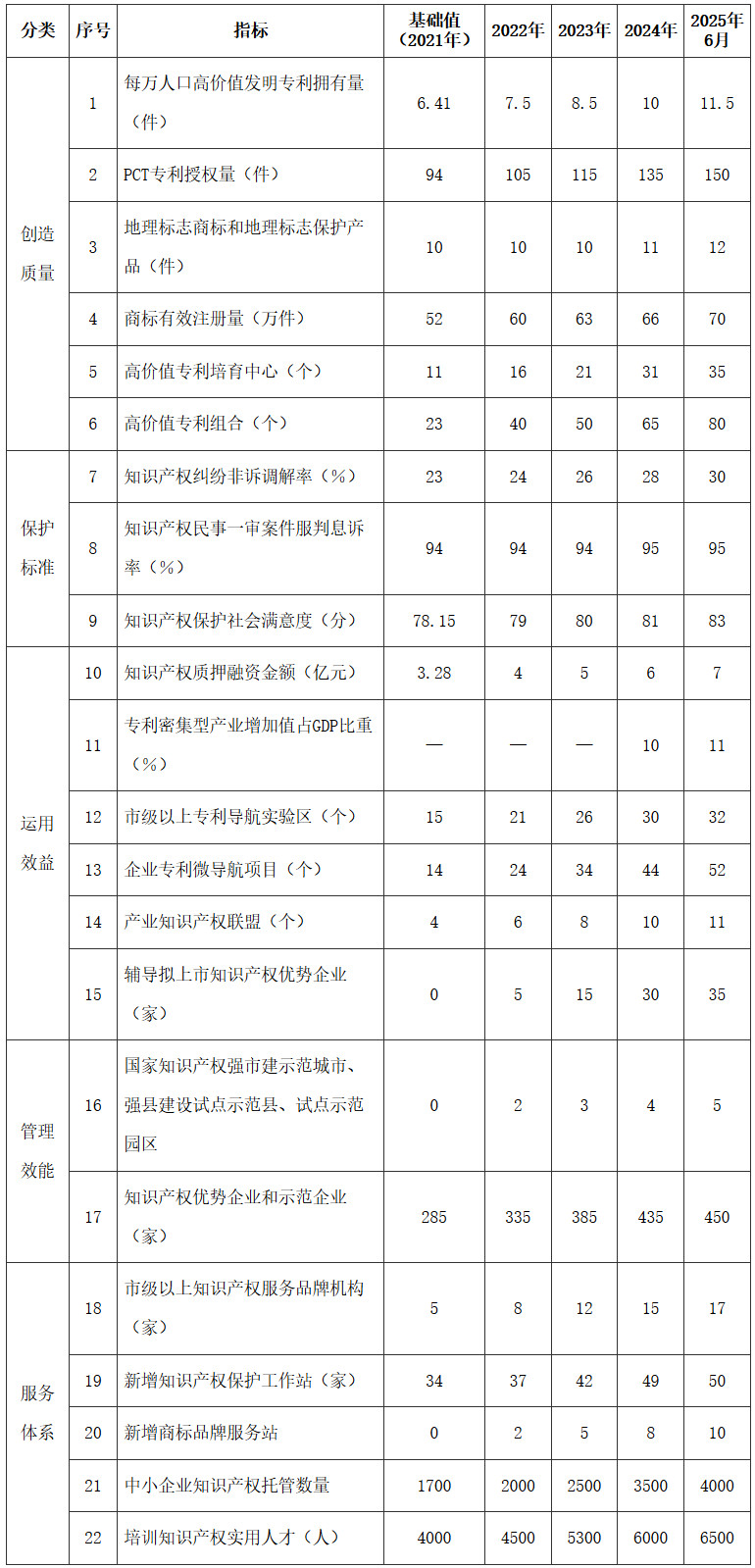 知識產(chǎn)權(quán)創(chuàng)造質(zhì)量顯著提高。知識產(chǎn)權(quán)高質(zhì)量產(chǎn)出主要指標(biāo)實現(xiàn)中部領(lǐng)先,在先進(jìn)制造業(yè)和特色產(chǎn)業(yè)領(lǐng)域形成一批高價值知識產(chǎn)權(quán)。到2025年6月,高價值發(fā)明專利擁有量力爭達(dá)到14653件,每萬人高價值發(fā)明專利達(dá)到11.5件,年度PCT專利授權(quán)量力爭達(dá)到150件,商標(biāo)有效注冊量力爭達(dá)到70萬件,作品(著作權(quán))登記量力爭達(dá)到13萬件。