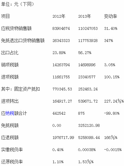 ②增值稅稅額變化情況:實(shí)際申報(bào)繳納增值稅2012年44.25萬(wàn)元,2013年僅0.08萬(wàn)元;免抵稅額2012年為0,2013年為325.21萬(wàn)元。