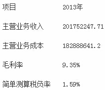 2013年度實(shí)現(xiàn)營(yíng)業(yè)收入210647541.53元(其中外銷收入117761418.77元,占總收入的55.90%),營(yíng)業(yè)成本185167674.93元,賬面利潤(rùn)總額10225389.14元。申報(bào)繳納增值稅875.76元,免抵稅額3252120.98元,免抵退應(yīng)退稅額5258099.44元,繳納企業(yè)所得稅 2665137.95元。