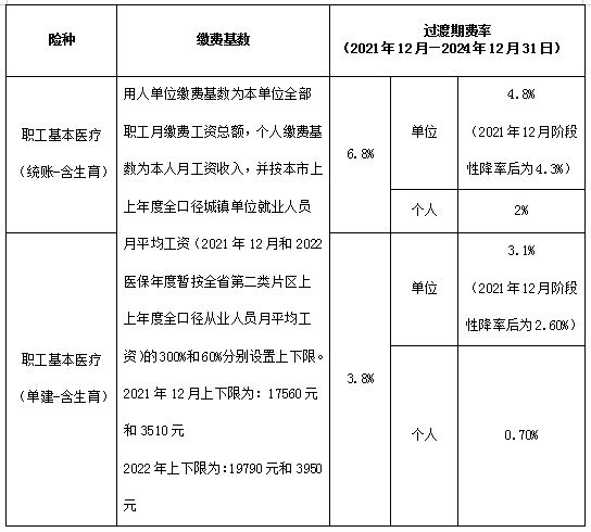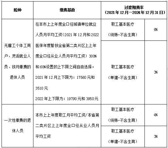 (一)參保險種轉換。為方便繳費人,2021年12月前,稅務機關將批量轉換原參保險種為新的參保險種。對用人單位職工、無雇工個體工商戶、靈活就業(yè)人員及以個人身份參保繳費的退休人員等,原參加基本醫(yī)療保險但不參加補充醫(yī)療保險的,轉換為參加單建統(tǒng)籌職工基本醫(yī)療保險;原同時參加基本醫(yī)療保險和補充醫(yī)療保險的,轉換為參加統(tǒng)賬結合職工基本醫(yī)療保險。具體轉換事項詳見附件。