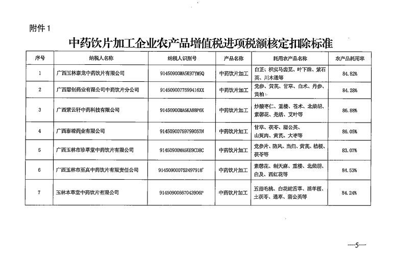 二、試點(diǎn)納稅人農(nóng)產(chǎn)品增值稅進(jìn)項(xiàng)稅額核定扣除辦法統(tǒng)一實(shí)行成本法,《中藥飲片加工企業(yè)農(nóng)產(chǎn)品增值稅進(jìn)項(xiàng)稅額扣除標(biāo)準(zhǔn)》(附件1)由國(guó)家稅務(wù)總局廣西壯族自治區(qū)稅務(wù)局發(fā)布。