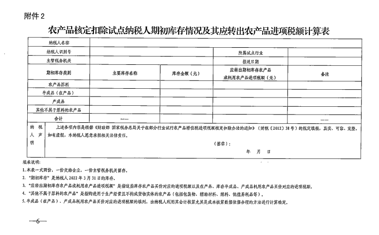 四、按照《實(shí)施辦法》第九條規(guī)定,試點(diǎn)納稅人應(yīng)自2022年4月1日起,將期初庫(kù)存農(nóng)產(chǎn)品以及庫(kù)存半成品、產(chǎn)成品耗用的農(nóng)產(chǎn)品增值稅進(jìn)項(xiàng)稅額作轉(zhuǎn)出處理。試點(diǎn)納稅人應(yīng)對(duì)期初庫(kù)存農(nóng)產(chǎn)品以及庫(kù)存半成品、產(chǎn)成品進(jìn)行實(shí)地盤庫(kù),并于2022年4月納稅申報(bào)期內(nèi)向主管稅務(wù)機(jī)關(guān)報(bào)送《農(nóng)產(chǎn)品核定扣除試點(diǎn)納稅人期初庫(kù)存情況及其應(yīng)轉(zhuǎn)出農(nóng)產(chǎn)品進(jìn)項(xiàng)稅額計(jì)算表》(附件2)。