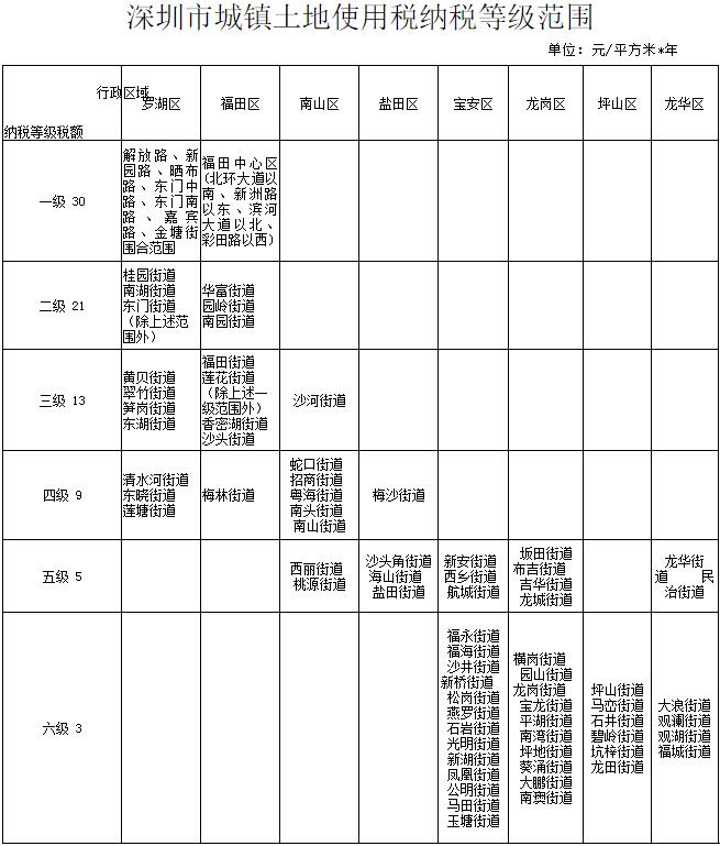附件:深圳市城鎮(zhèn)土地使用稅納稅等級(jí)范圍