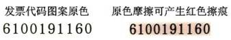 發(fā)票各聯(lián)次左上方的發(fā)票代碼使用防偽油墨印制,油墨印記在外力摩擦作用下可以發(fā)生顏色變化,產(chǎn)生紅色擦痕(如下圖所示)。