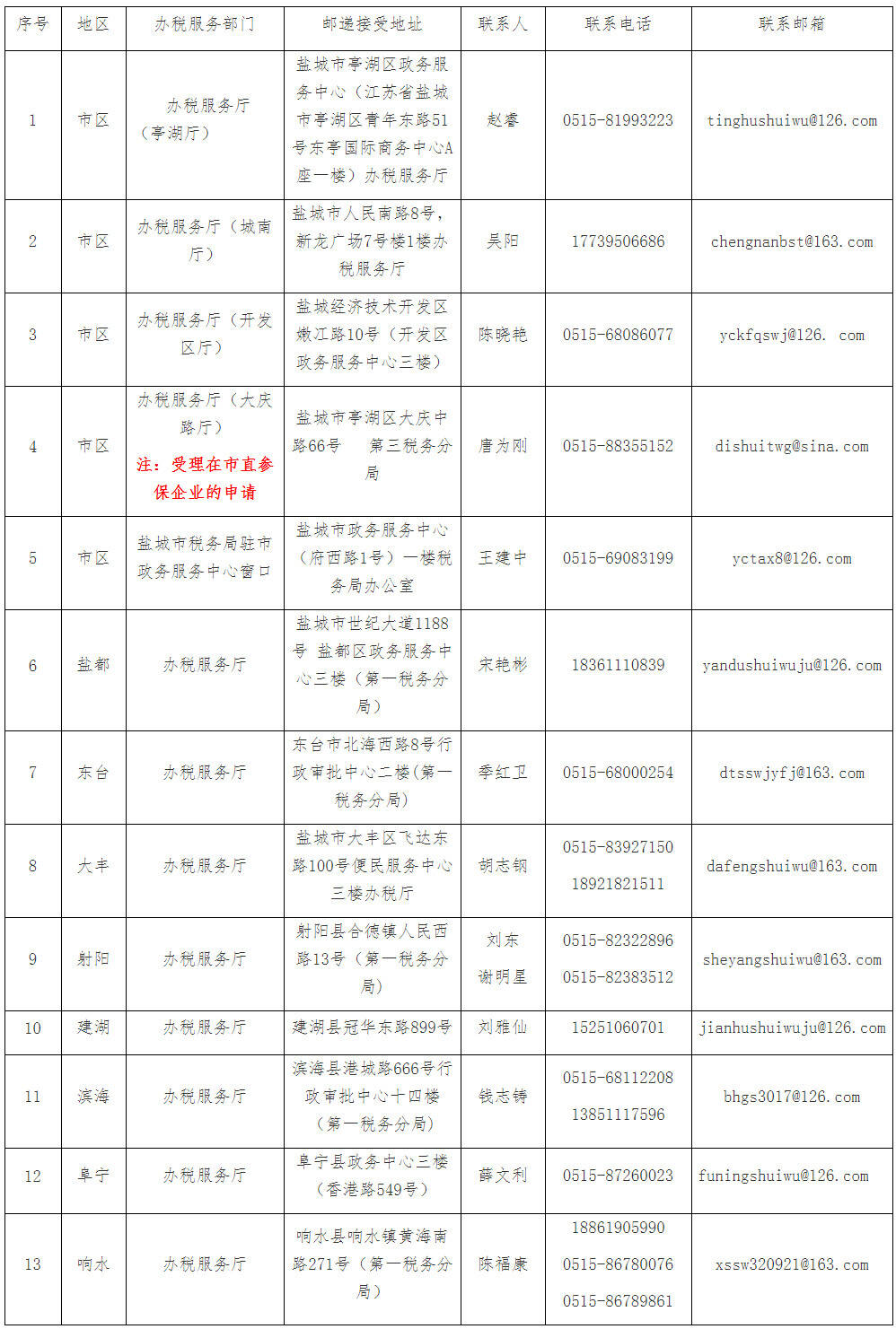 鹽城市稅務(wù)部門接受郵遞辦稅地址及聯(lián)系方式