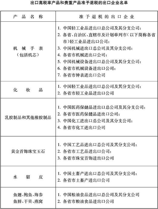 二、1991年12月14日前由經(jīng)貿(mào)部批準(zhǔn)指定經(jīng)營高稅率產(chǎn)品和貴重產(chǎn)品的出口企業(yè)和列入本通知附表的外貿(mào)、工貿(mào)企業(yè)在1991年底以前出口指定的高稅率、貴重產(chǎn)品,經(jīng)核實(shí)后,可按規(guī)定申請(qǐng)辦理退稅,其他企業(yè)出口的,一律不予退稅。