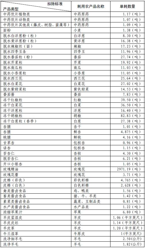 一、全省統(tǒng)一的扣除標準(農產(chǎn)品單耗數(shù)量)